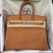 This stunning Hermès Birkin 35cm bag is featured in Toffee color. This bag is made from Taurillon Novillo leather, which is made from bull and has a naturally finely textured grain. The blind stamp located inside the bag is C, which indicates 2018 as the year of production.